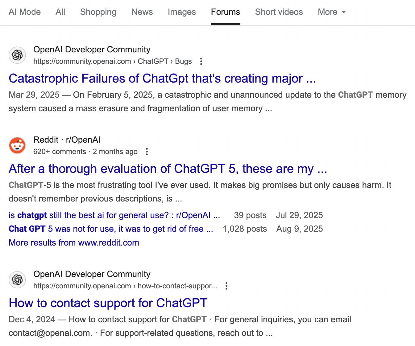 The Google Forums API returns discussion-style results from community platforms like OpenAI Community and other forums surfaced on Google. It provides: