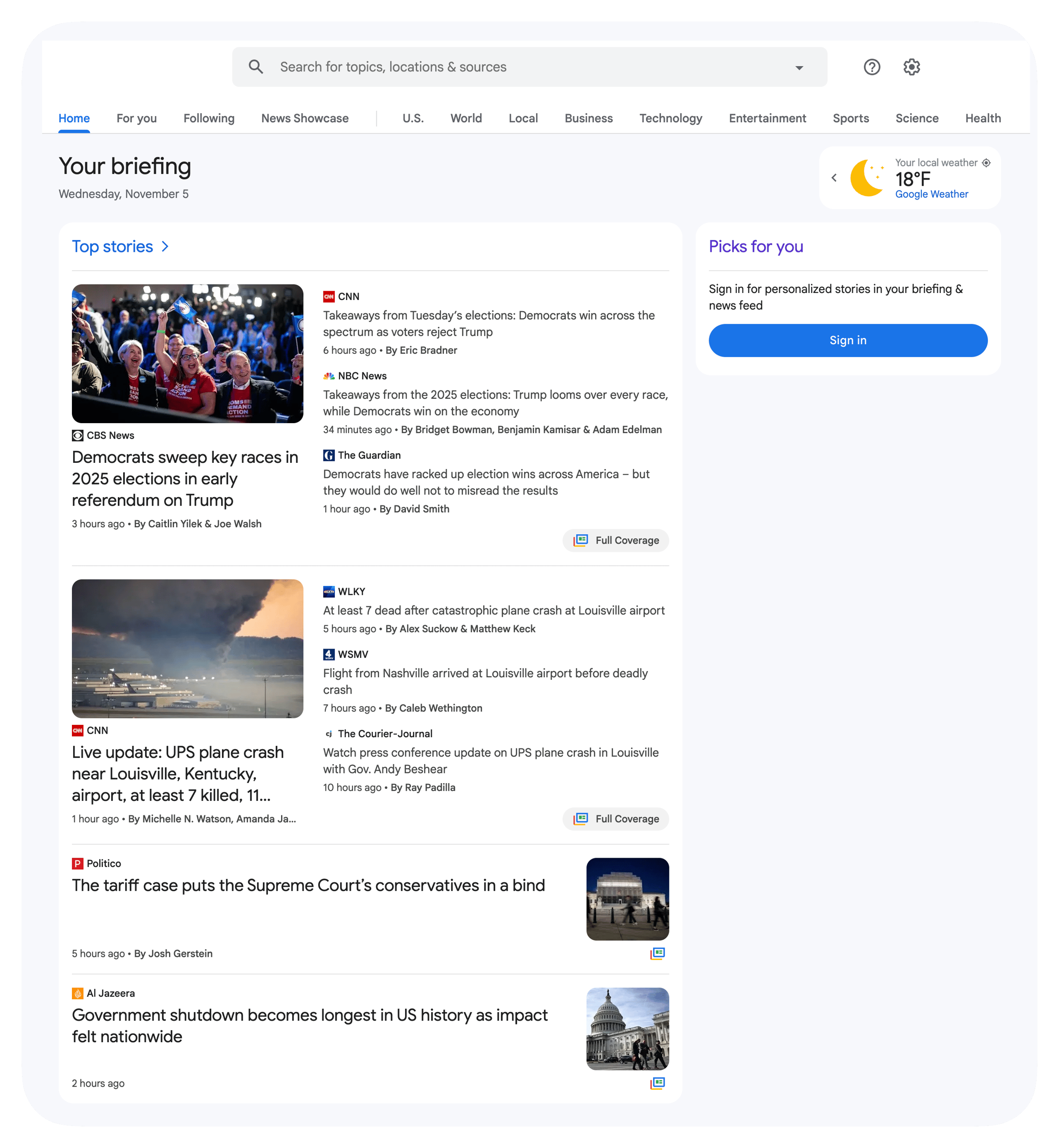 The Google News Portal API returns full article listings, menus, and topic data from Google News pages. It includes: