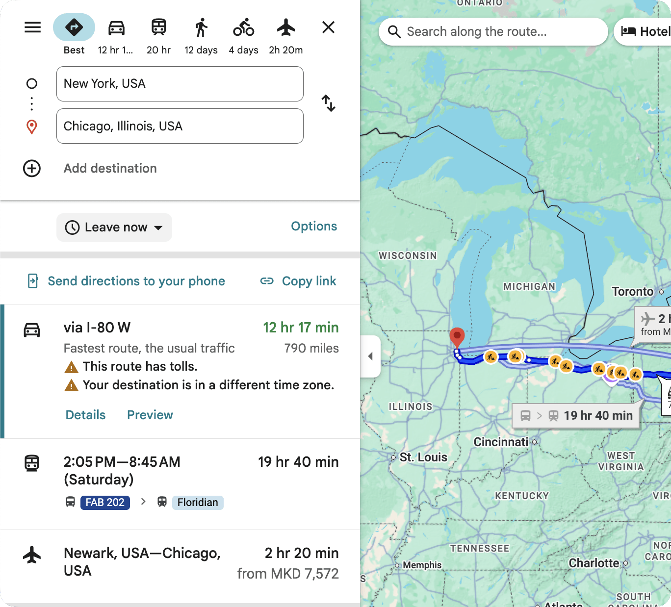 - Travel modes - Driving, Transit, Flying, and more, each with estimated durations and distances.